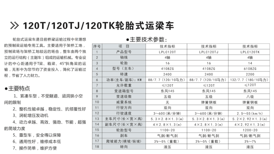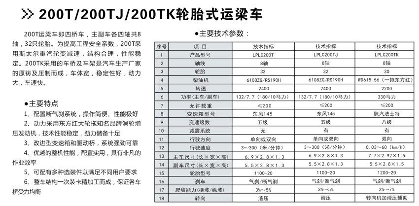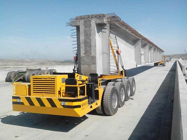 運梁車,又稱運梁平車、運梁炮車、炮車,是將在預制廠或橋梁現場預制的鋼筋混凝土梁橋橋面板運送到架橋機的專用車輛。本車具有載重量大、自行式、運輸不受距離限制。性能可靠,安全設施齊全,整機結構合理,運轉平穩,操作舒適,制造成本相對較低,維修方便,抗傾覆穩定性好,生產效率高等特點。操作簡單方便,操作司機只需簡單的培訓即可勝任。維修方便,配件都屬于國標件。運梁車是為公路橋梁架設專門設計的預制梁運輸機械。輪胎式運梁平車主要適用于預制梁場與架橋工地較遠,不適合鋪軌或鋪軌費用較高的場合。運梁車的剎車系統對縱坡有