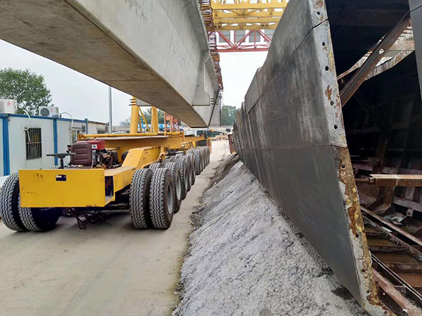 運梁車,將在預制廠或橋梁現場預制的鋼筋混凝土梁橋橋面板運送到架橋機的專用車輛。分軌行式和輪胎式等。主要由幾十個驅動輪與從動輪、車架、駕駛室、操縱控制系統、輔助裝置等組成。由于載重大(達千噸),故要求高度低,以降低架橋機總體高度。是架橋機施工的配套設備。