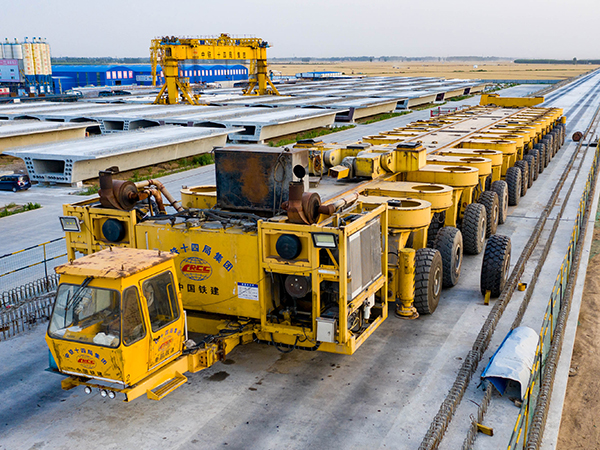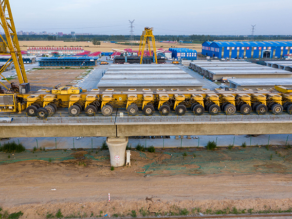 1.450t-900t 運梁車主要用來運輸大噸位混凝土預制箱形梁,可降單線或雙線整孔箱梁從預制場轉運至架梁工位,與架橋機配合完成相應的架梁作業。同時,運梁車還可馱運架橋機實現橋間短途運輸,滿足架橋機轉場作業的要求。